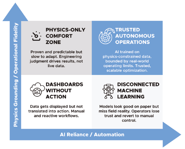 Most oil and gas AI applications can be characterized as pattern recognition, a function of machine learning. The models spot correlations and generate forecasts that look good on paper but often clash with historical field experience. When a recommendation does not line up with what operators or supervisors expect, the model gets ignored as implausible. The opposite extreme is no better. Many companies fall back on physics-only solutions, relying on equations and design assumptions that cannot keep up with real-time variability. Either approach, on its own, leaves gaps.