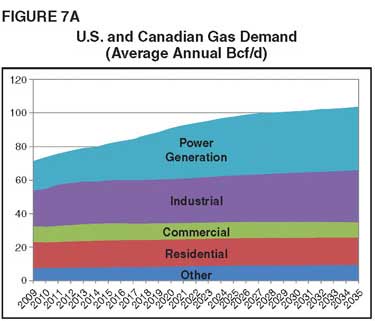 On an annual basis, gas demand for electric generation should grow 1.0 Bcf-1.5 Bcf a day over the next five to 10 years, which would be consistent with prerecession trends. Gas-fired power generation was expanding at a pace of 1.0 Bcf/d per year prior to 2009, and that trend should resume as the economy gathers momentum. Consumption in the power sector could double over the next 20 years, increasing total North American demand to an average of 104 Bcf/d by 2035 (Figure 7A). With little growth anticipated in industrial, commercial and residential consumption, electric generation is obviously the critical sector for natural gas.