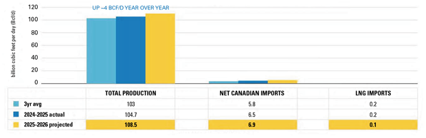 U.S. natural gas production is expected to average a record 108.5 Bcf/d over the winter months, a year-over-year increase of 4 Bcf/d, driven by continued drilling efficiency and a strong supply response to both domestic and export demand needs (Figure 1). Current storage and production output levels appear sufficient to balance incremental winter demand and record LNG exports. Net Canadian imports also remain strong at 7 Bcf/d, up ~0.5 Bcf/d from last year, reflecting the reliance on cross-border inflows and the interconnected nature of the U.S. natural gas pipeline system.