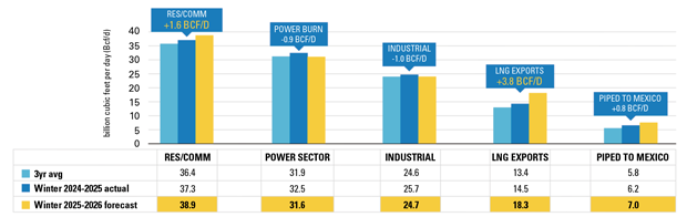 On the demand side of the ledger, total consumption is set to rise by 4.2 Bcf/d year over year (Figure 2). Weather is expected to be moderate across much of the lower 48, but 3.2% cooler than last winter and 4% cooler than the average of the past three winters. Consequently, the Winter Outlook forecasts 3,475 heating degree days this winter versus 3,408 heating degree days last winter. Residential and commercial space heating demand should climb by 1.6 Bcf/d versus the winter of 2024-25.