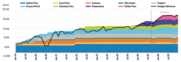 The addition of the Plaquemines LNG terminal keeps the United States on track to maintain its position as the world’s top LNG exporter, with export capacity projected to exceed 30 Bcf by 2030. With ongoing capacity gains, U.S. LNG is positioned to remain a cornerstone of global supply as international buyers seek dependable volumes amid weather volatility and ongoing energy security concerns.
