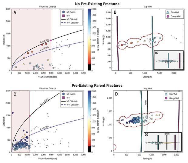 The real value in having both microseismic and SWPM datasets came from subsequent analyses. The SWPM and microseismic agree in the case with no pre-existing hydraulic fractures (Figures 2A and 2B). Both show fracture growth with similar fracture diffusivity. When pre-existing fractures were near a parent well (Figures 2C and 2D), microseismic showed a similar fracture diffusivity, but SWPM showed higher fracture diffusivity with a comparably rapid fracture growth rate over time. This rapid response is interpreted to be a cluster that was diverted, or short-circuited, into a parent fracture, while the remaining clusters in the stage grew new hydraulic fractures, as seen in the microseismic data.