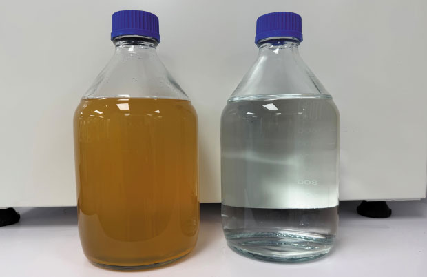 Transforming produced water from a waste stream into a valuable commodity requires cost-effective techniques for removing salt and other concerns. Aquafortus says its desalination technology, which turned the produced water sample on the left into the clean water on the right, is so affordable that it can make desalinating and repurposing produced water less expensive than disposal.