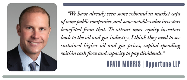 Morris says he even sees some cause for optimism in the public markets. “We already have seen some rebound in market caps of some public companies, and some notable value investors benefited from that,” he remarks. “To attract more equity investors back to the oil and gas industry, I think they need to see sustained higher oil and gas prices, capital spending within cash flow and capacity to pay dividends.”