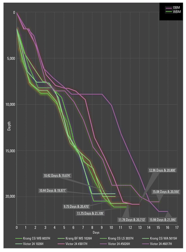 Despite initial concerns about lubricity, drilling with WBM on the Krang pad outperformed drilling with OBM on the Victor pad. The difference equated to a 13% cost improvement, Sellers says. The WBM system included a mix of lubricants and some diesel. While OBM mud was kept on site in the event WBM performed poorly, it was not used.