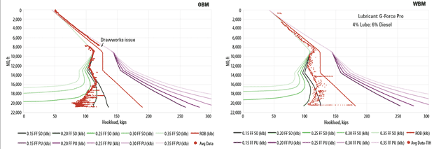 Preplanning also included validating friction factors in models. Friction factors showing the resistance between the drill string and the wellbore can vary widely between OBM and WBM fluids, but the numbers for both were remarkably similar in some cases, Sellers says.