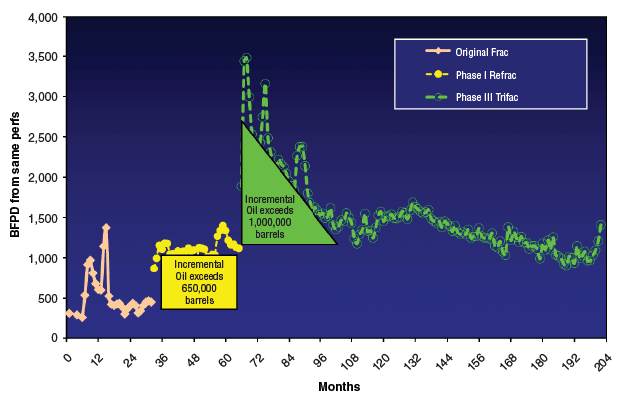 Figure 4 illustrates how a refrac and subsequent tri-frac incrementally generated higher oil recoveries without adding new stages or perforations. “Although the well produced 400 barrels of oil a day and was highly profitable as initially stimulated, the initial frac job failed to reveal the true potential of the well,” Vincent reveals. “Only after refracturing did the operator recognize that the formation was capable of producing at much higher rates.”