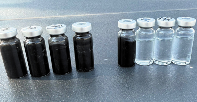 Rapid Water Technologies used serial dilution bottles to show the impact of its nanobubble-assisted treatment on sulfate-reducing bacteria in injection water, with the dark vials on the left representing untreated samples and the clear vials on the right showing bacteria reduction after 30 days of treatment using a static sidestream nanobubble generator. The company says the samples went from 1,000–9,999 colonies per milliliter down to just 1–9 colonies/mL—levels low enough that most oil producers could forego additional bacterial treatment.