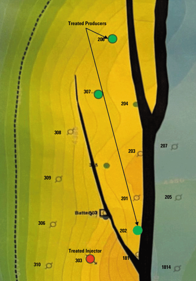 One of the treated producers exhibited a particularly notable response, with water cut dropping from approximately 80% to 0% immediately following treatment.