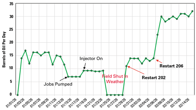 The production response occurred quickly following treatment. During the post-treatment period from January 29 through February 15, average oil production across the pilot area increased to approximately 30 bbl/d, a 100% increase relative to pre-treatment levels.