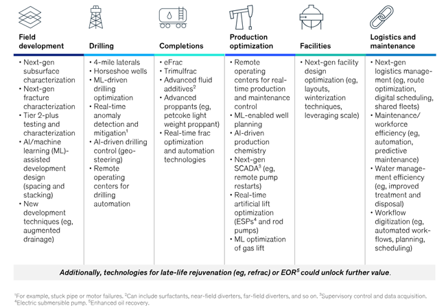 Several paths to achieving that goal exist. “We have identified 27 emerging innovations that could reduce both capital and operating costs, and even unlock higher recovery factors, reducing breakevens by between $7 and $13 per barrel of oil equivalent,” McKinsey says. “These innovations could elevate between 55,000 and 80,000 Tier 2 drilling sites to Tier 1 status, potentially extending shale’s peak by up to three years and increasing U.S. onshore oil production to as many as 13 million barrels of oil per day.”