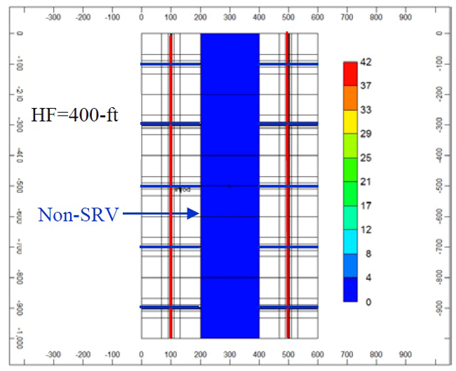 Figure 6 presents a more realistic case of a discrete fracture network. The stimulated rock volume is not continuous and the two SRV areas on 400-foot fracture spacing are separated by a 200-foot non-SRV interval. For the nonstimulated reservoir rock volume zone (0.001 mD fracture permeability), the dual-permeability model was used to simulate fluid flow without refining the grid blocks. Fracture network spacing was kept constant as 200 feet.